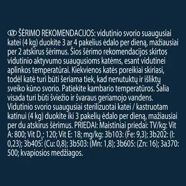 Vidutinio svorio suaugusiai sterilizuotai katei / kastruotam katinui (4 kg) duokite iki 3 pakelių ėdalo per dieną, mažiausiai per 2 atskirus šėrimus.